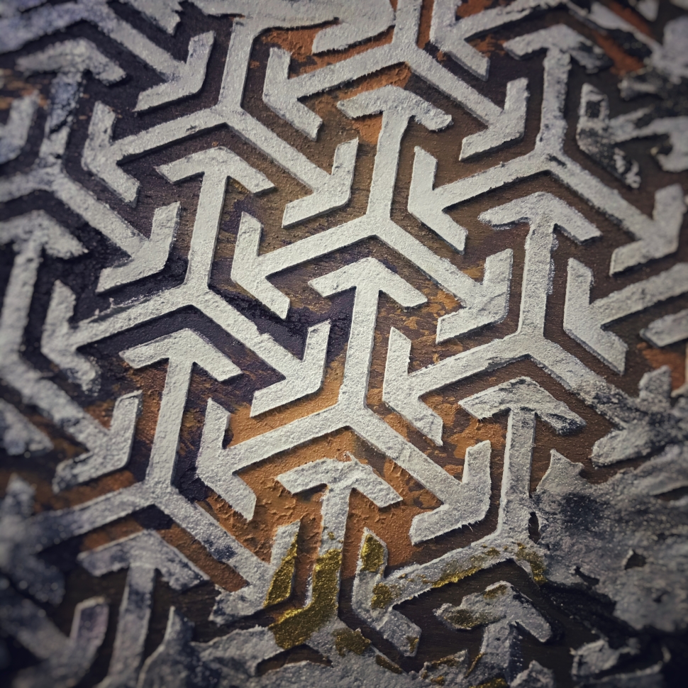 Этот трафарет идеально стыкуется в бесконечном раппорте, брутальный стиль, прекрасен для мужских работ с имитацией фактур железа, камня, окислов и ржавчины в стиле лофт.